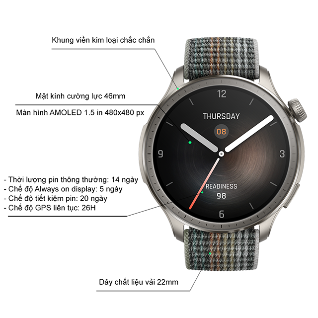 Được bảo vệ bởi tấm kính cường lực có lớp phủ chống chói hàng đầu, màn hình HD AMOLED mở rộng có độ sáng lên đến 1.500 nits, độ phân giải 480x480px, mật độ điểm ảnh 323 PPI, người dùng dễ dàng quan sát thông tin khi vận động, kể cả khi trời nắng gắt.