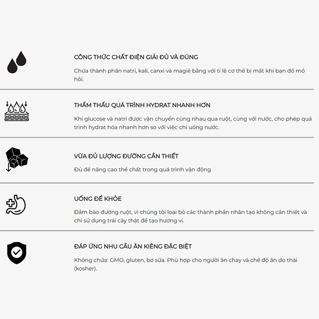 • Tăng cường quá trình thẩm thấu đường và chất điện giải cho phép đẩy nhanh quá trình hydrat hóa, đáp ứng nhu cầu hấp thụ năng lượng nhanh chóng.