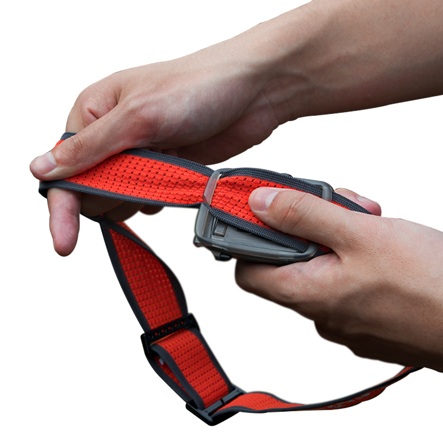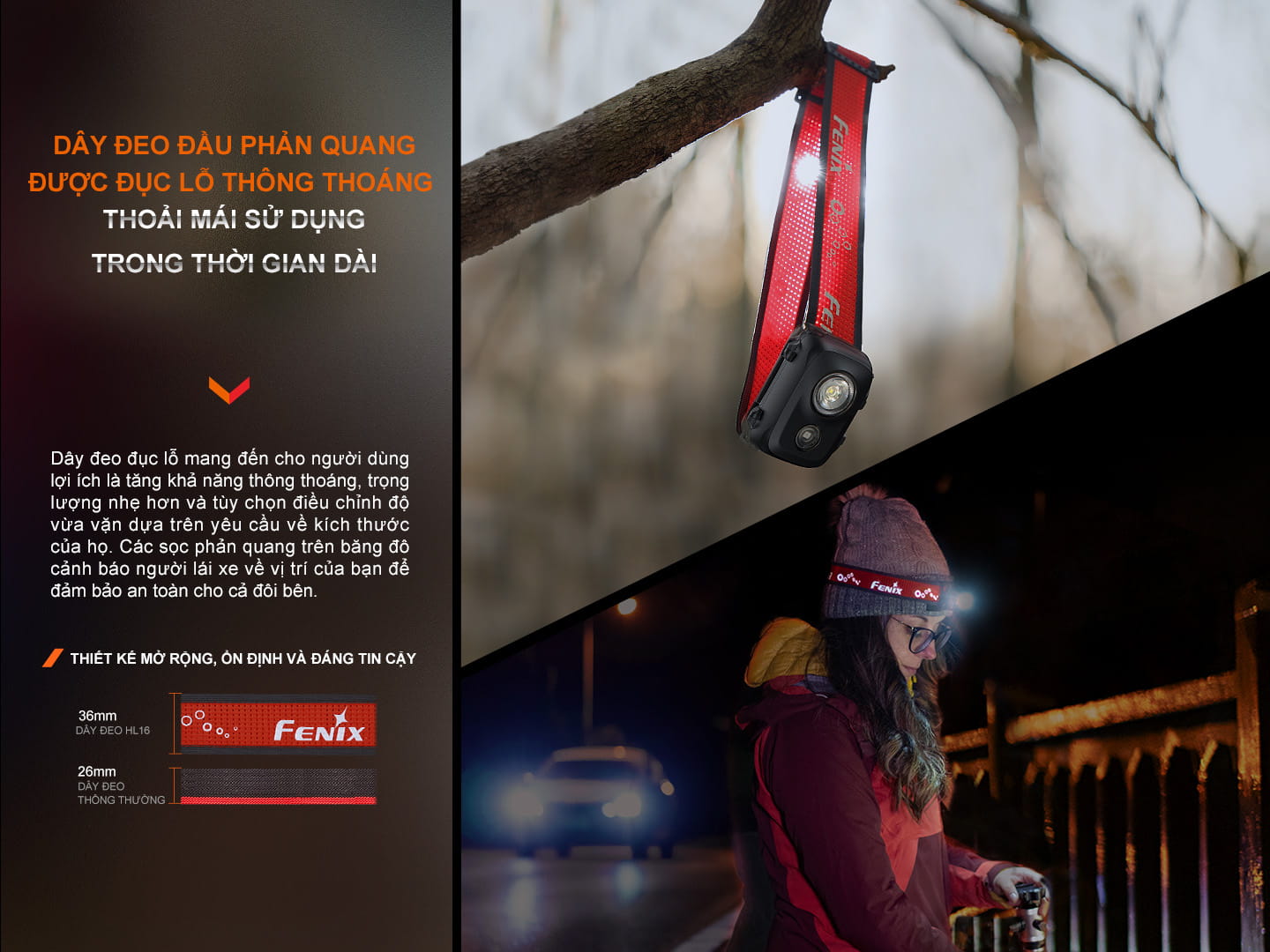 Dây đeo cũng là phần tạo ra khác biệt rõ nhất về “độ dễ chịu” khi dùng lâu, nhất là với những chuyến race dài hoặc trekking xuyên đêm.Dây của Fenix HL16 là bản rộng, có lỗ thoáng, hỗ trợ thấm mồ hôi và thoáng khí, đồng thời tích hợp phản quang để tăng nhận diện khi di chuyển trong điều kiện thiếu sáng. Dây bản rộng giúp lực được trải đều hơn trên đầu (đỡ hằn, đỡ cấn), còn thoáng khí giúp giảm cảm giác bí nóng.