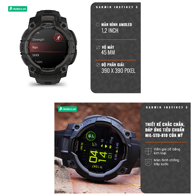 Instinct 3 là chiếc đồng hồ thông minh GPS chắc chắn với viền gia cố bằng kim loại và màn hình chống trầy.