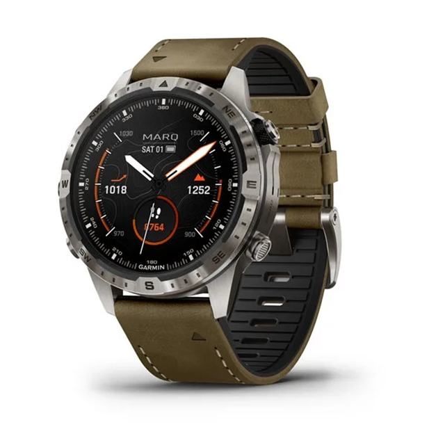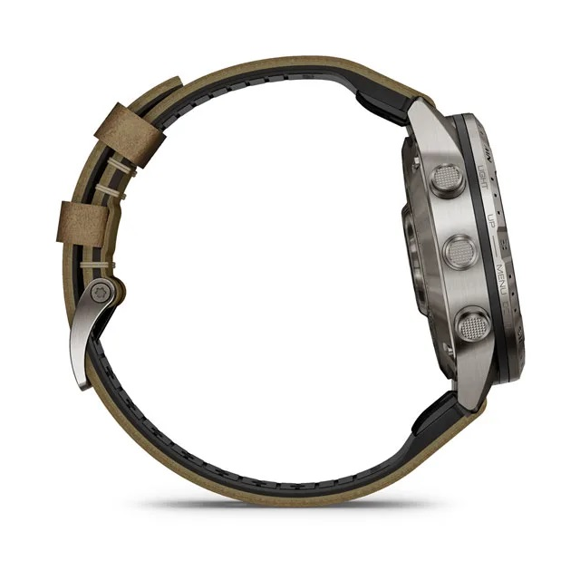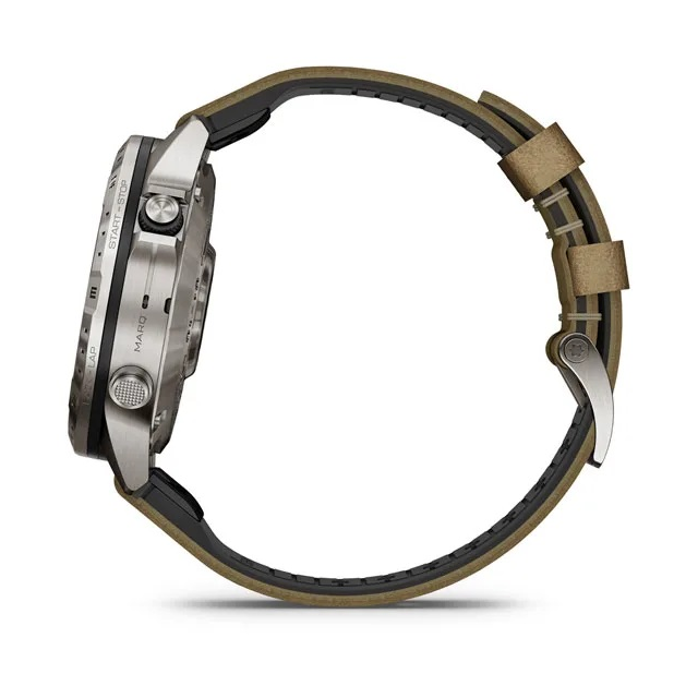 Đồng hồ có thiết kế la bàn cổ điển với vật liệu titan cấp 5, siêu cứng, 46 mm và dây đeo hỗn hợp bằng da và cao su FKM mới có khả năng chống mồ hôi và vết bẩn cho mọi cuộc phiêu lưu