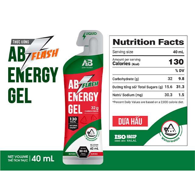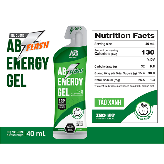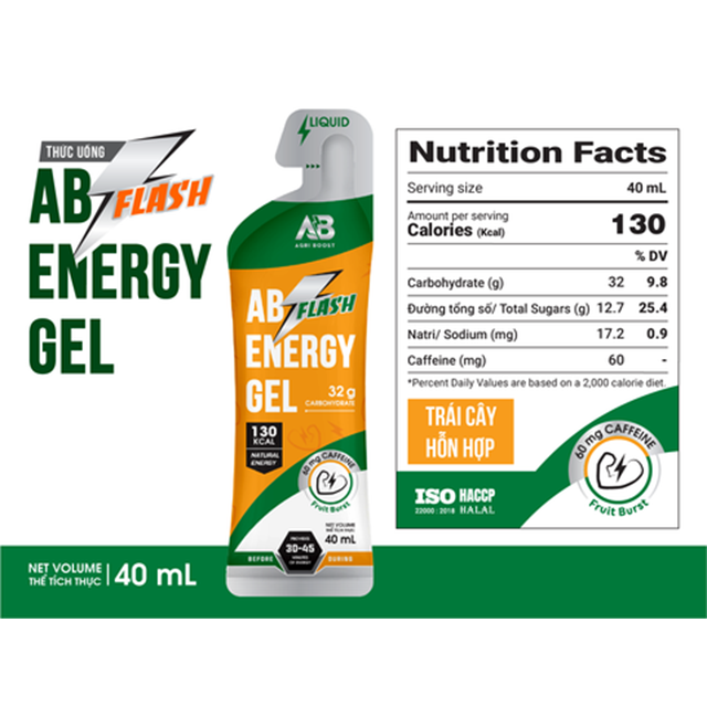 Mỗi gói 40ml cung cấp 130kcal từ 32g carbohydrate, giúp bạn bổ sung năng lượng nhanh chóng, và duy trì hiệu suất tối đa trong quá trình vận động.