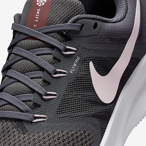 Phần lưỡi gà trên Swift 3 được trang bị miếng đệm dày dặn mang đến độ êm ái cao cho bàn chân, đặc biệt là phần mu bàn chân. Kết hợp với phần đệm mềm mại có độ bền cao được trang bị quanh phần cổ giày giúp giày có thể bảo vệ tốt phần mu bàn chân cùng phần cổ chân khỏi chấn thương khi va chạm trên đường chạy. Như nhiều mẫu giày đến từ nhà Nike, hệ thống dây buộc được trang bị trên Swift 3 là hệ thống Flywire giúp cố định tốt giày với chân mang đến sự vừa vặn, an toàn và hỗ trợ bàn chân tránh bị trơn trượt phần ngón và gót chân khi chạy