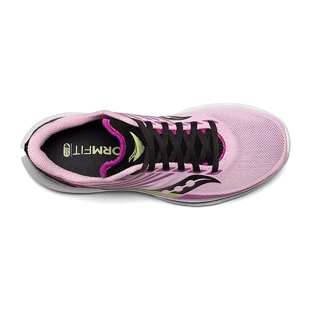 Saucony Kinvara 12 có thiết kế đơn giản với phần mặt trên được tối giản khi chỉ trang bị duy nhất cho mình lớp vải lưới kỹ thuật và loại bỏ những phần đệm thừa thãi giúp đảm bảo độ thoáng mát cho chân, nhưng vẫn có thể bảo vệ bàn chân người đeo khỏi 1 số các chướng ngại vật nhỏ. Kết hợp với phần dây buộc được thiết kế phẳng cùng phần lưỡi gà dày 5.5mm giúp cố định phần chân người dùng khi di chuyển, giảm thiểu chuyển động dư thừa từ đó tăng cường hiệu suất tốc độ. Tuy được loại bớt nhiều phần đệm dư thừa nhưng Kinvara 12 vẫn được trang bị cho mình các tấm đệm ở phần lưỡi gà và xung quanh phần cổ giày giúp đảm bảo độ thoải mái cho mu bàn chân, tránh gây ra các thương tích khi sử dụng lâu dài.