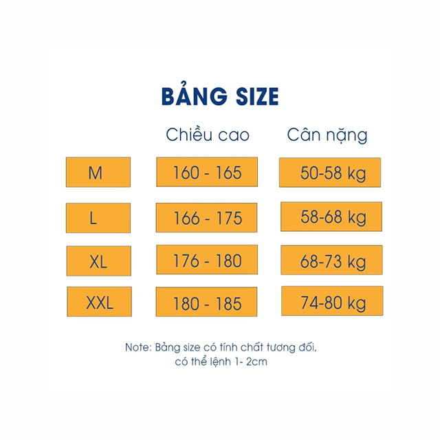 | Size | Chiều cao (cm) | Cân nặng (kg) |