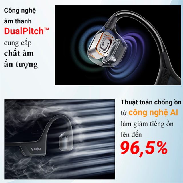 Công nghệ DualPitch mang đến sự kết hợp hoàn hảo giữa loa truyền âm thanh qua xương và không khí, mang đến trải nghiệm nghe độc đáo, rõ ràng và mạnh mẽ.