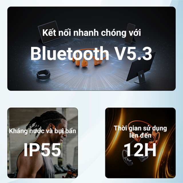 Tai nghe thể thao Shokz OpenRun Pro 2 được trang bị công nghệ Bluetooth V5.3 với độ ổn định cùng khả năng kết nối nhanh chóng trong phạm vi 10m. Nhờ vậy tai nghe luôn mang đến chất âm rõ ràng, ổn định với độ trễ siêu thấp, khiến người dùng có trải nghiệm âm nhạc hoàn hảo, không bị delay hay chập trờn với tín hiệu không ổn định. Ngoài ra với khả năng tối đa hóa lượng điện năng tiêu thụ giúp tai nghe có thể sử dụng trong thời gian dài, tránh bị hao hụt pin nhanh chóng khi so với các phiên bản tiền nhiệm.